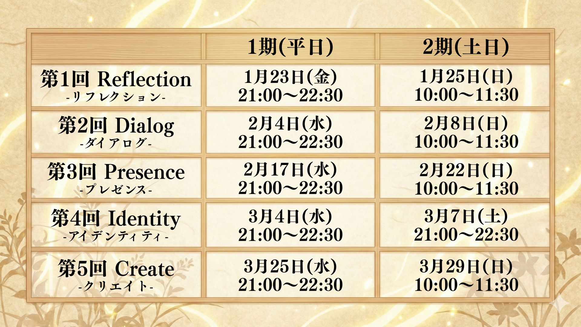 選べる2つの日程(1期・2期):「仕事や家事が落ち着いた平日の夜に集中したい」「週末の静かな時間を使って深く自分と向き合いたい」など、ご自身のライフスタイルに合わせて日程を選択いただけます。