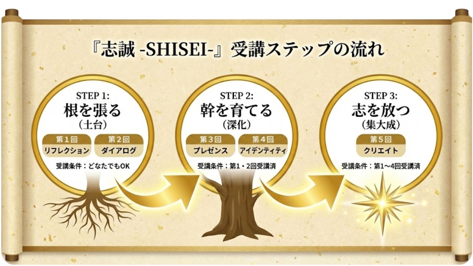 単なる知識の習得ではなく、命の根源から未来を創る「生き方の変革」を目指すプログラムです 。 そのため、単発での受講も可能ですが、「根を張り(土台)、幹を育て(確立)、花を咲かせる(志)」という一貫したプロセスを大切にするため、以下のステップ制を導入しております。
